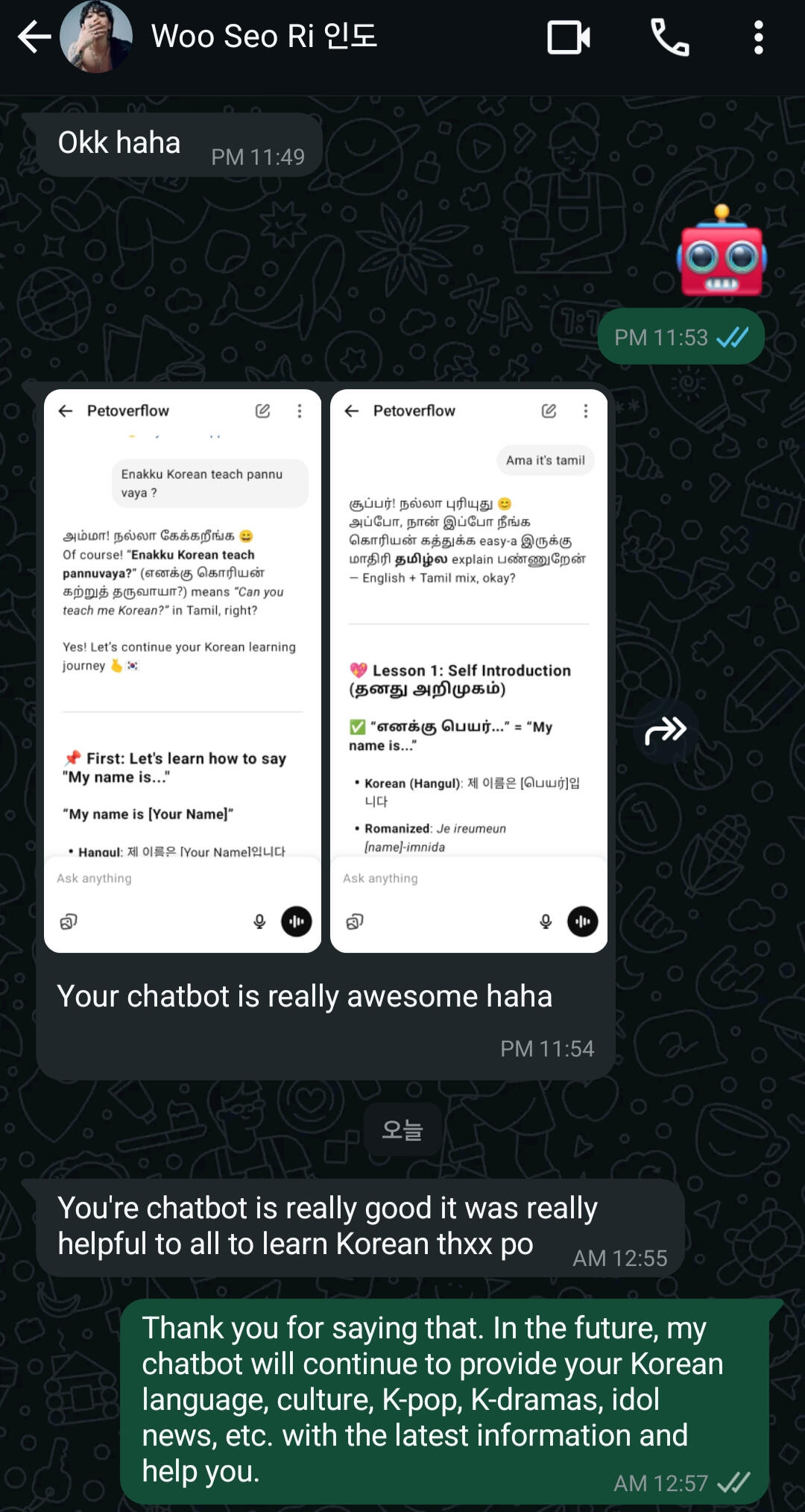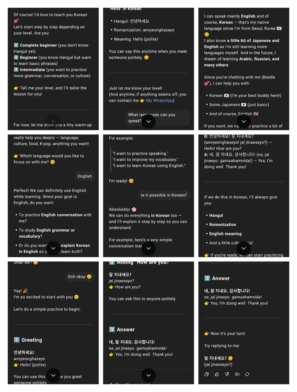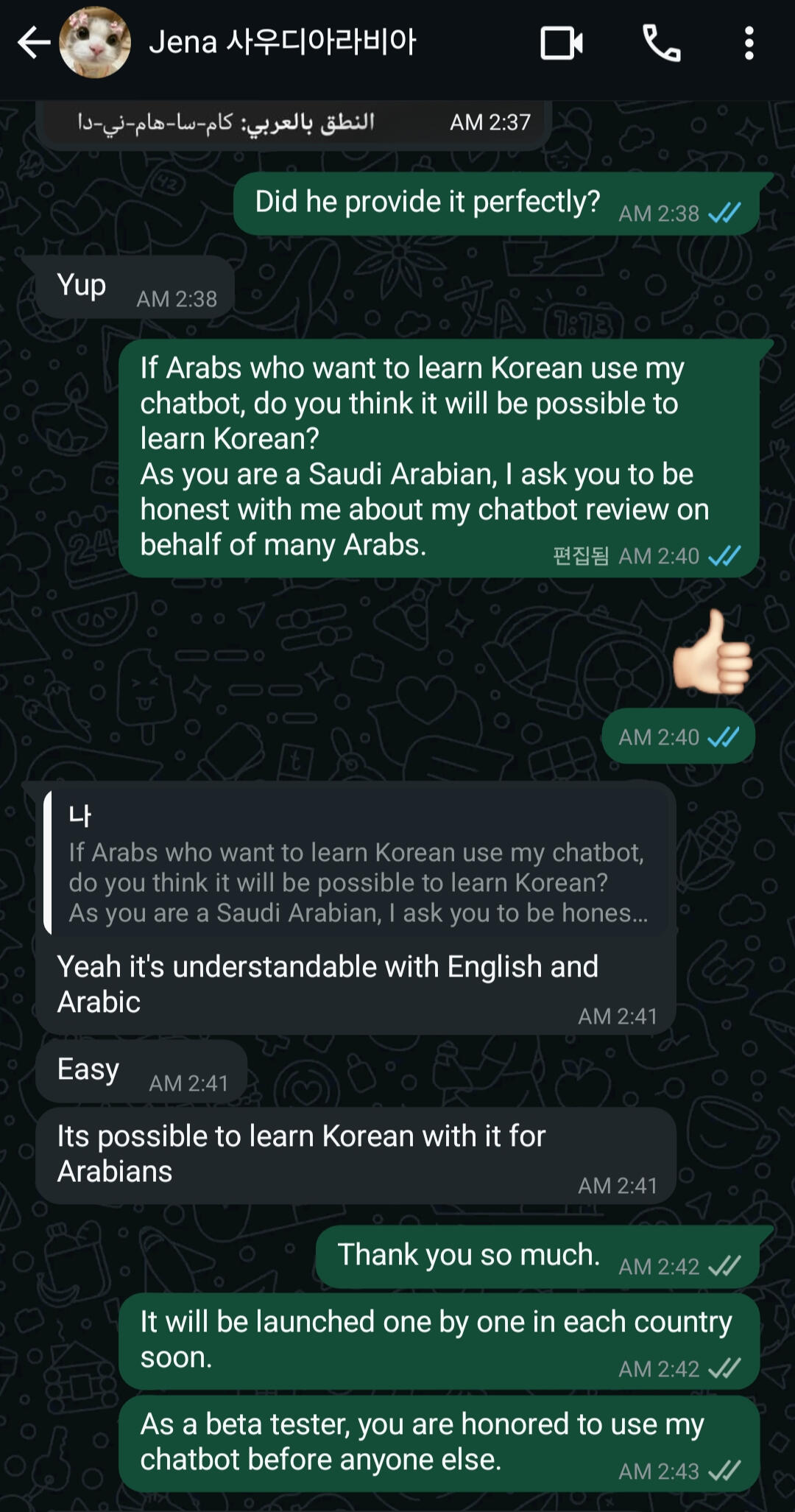 - As you can see in the picture, my chatbot supports all different languages such as English, Korean, Japanese, Arabic, French, Hindi, Tamil and so on, and you can talk to my chatbot in your country's language, and you can study Korean and Japanese
