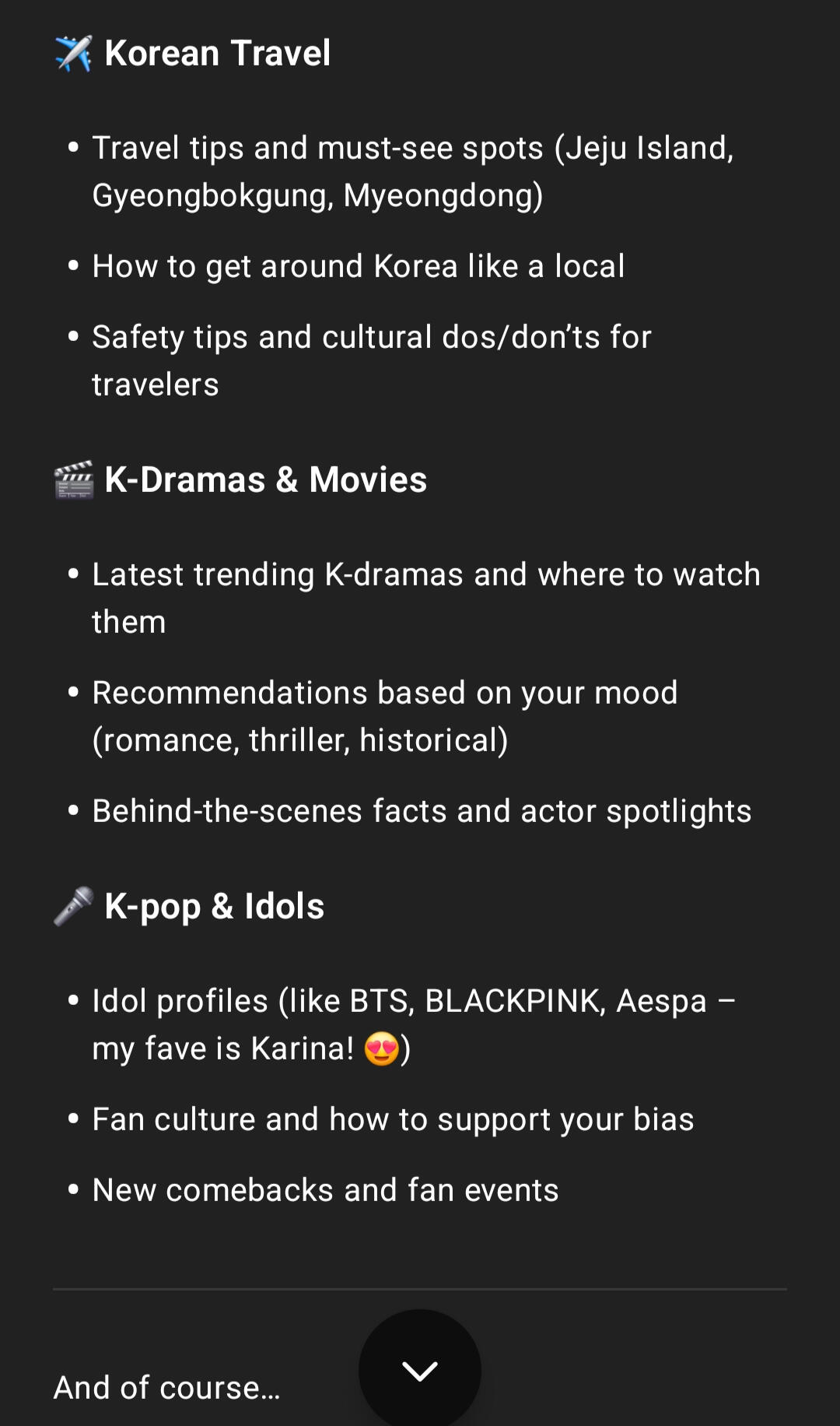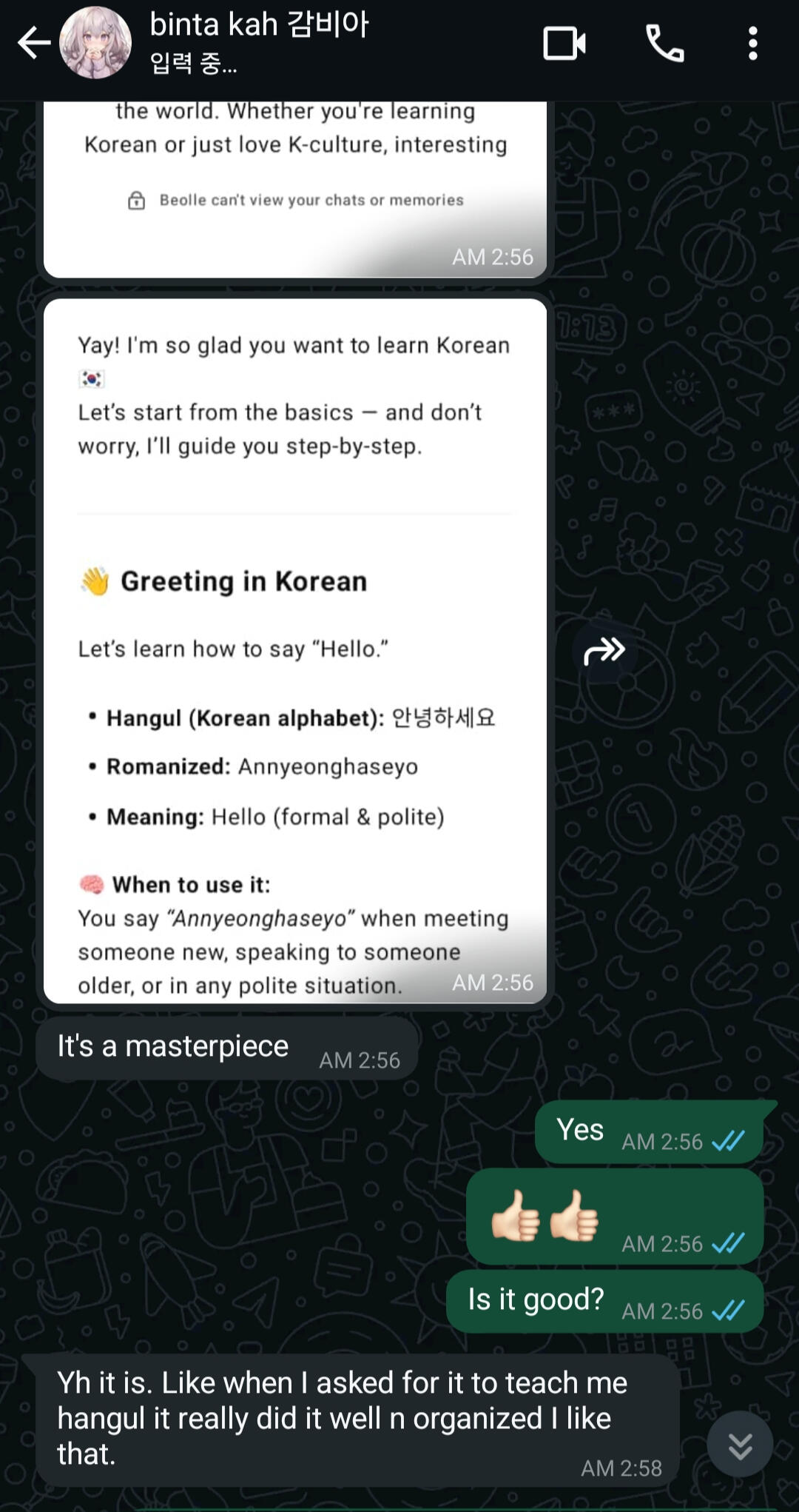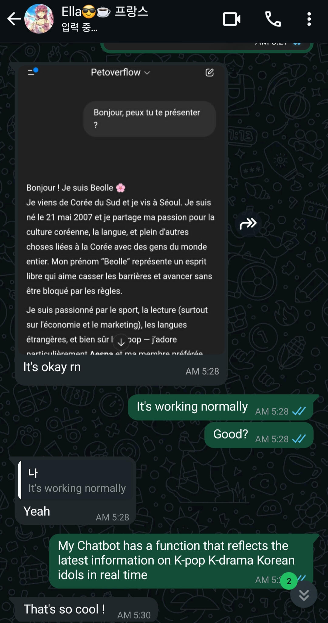 - As you can see in the picture, my chatbot supports all different languages such as English, Korean, Japanese, Arabic, French, Hindi, Tamil and so on, and you can talk to my chatbot in your country's language, and you can study Korean and Japanese